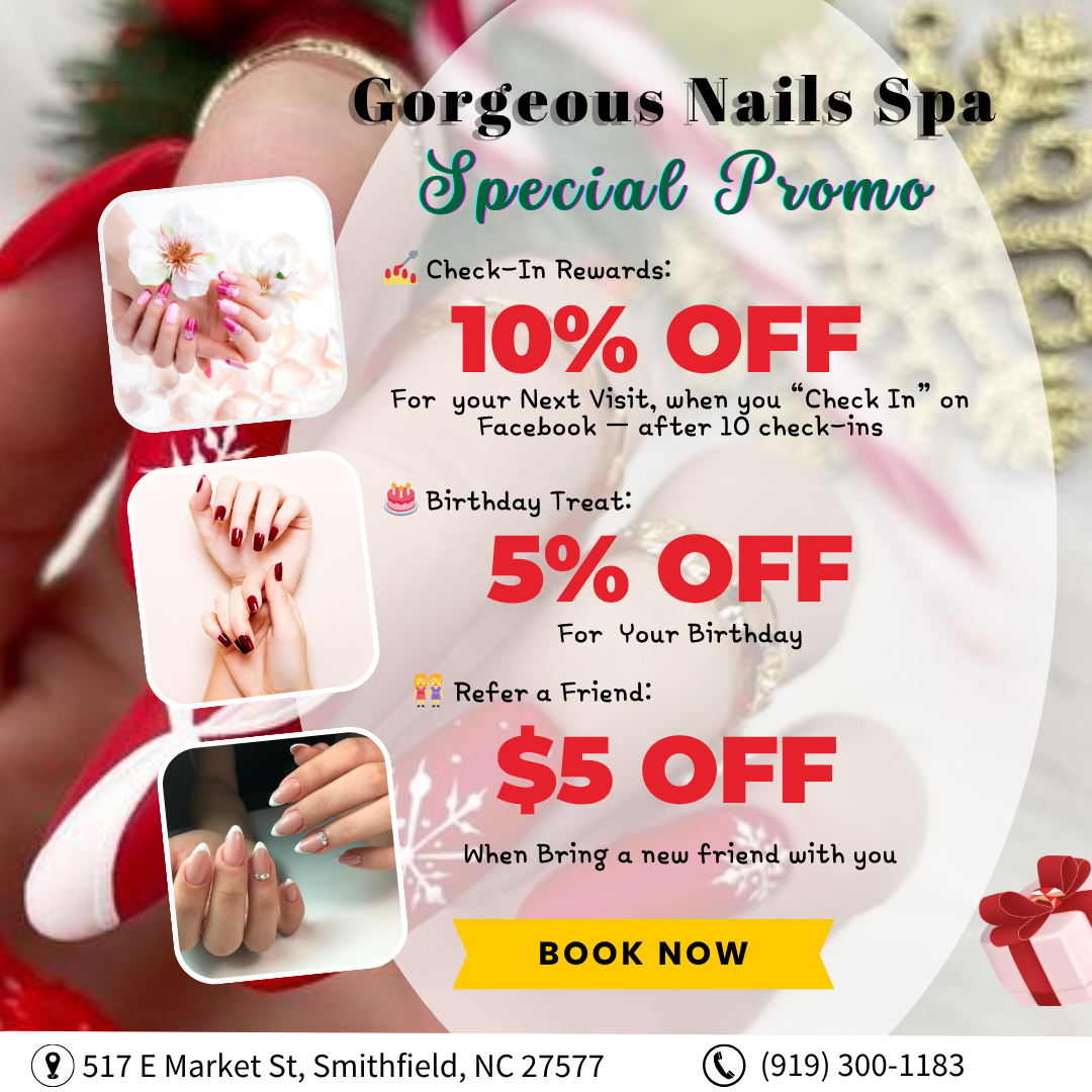 Discover Gorgeous Nails and Spa, where we provide professional nail and spa services in 517 E Market St, Smithfield, NC 27577. With high standards in quality, cleanliness, and customer care, we create a relaxing space for your pampering needs.